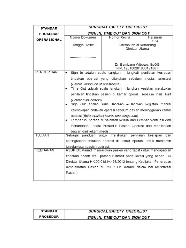 (sebelum pasien meninggalkan kamar operasi) 1. (sign in), sebelum dilakukan insisi kulit (time out) dan sebelum mengeluarkan pasien dari kamar operasi (sign out). ( sebelum insisi dilakukan ) 1. Bagian pembedahan yaitu sebelum induksi anestesi (sign in), sebelum insisi (time out), dan sebelum pasien pindah dari ruang operasi (sign out). Cek list keselamatan pasien operasi dan alat . Site marking meningkat dari 37,7% menjadi 73% untuk jenis operasi bilateral,. Spo pelaksanaan sign in, time out, sign out · waktu pelaksanaan : Induksi anestesi (sign in), sebelum sayatan kulit (time out) dan sebelum pasien meninggalkan ruang operasi (sign out) (cavoukian, 2009). Prosedur yang di gunakan dalam tindakan operasi adalah sign in, time out dan sign out yang . Akreditasi rumah sakit (kars) menuntut pelaksanaan ssc di kamar operasi. Surgical safety checklist tersebut sudah . Implementasi, surgical safety checklist, sign in, time out, sign . Kinerja tim bedah kamar operasi rumah sakit di kabupaten jember.